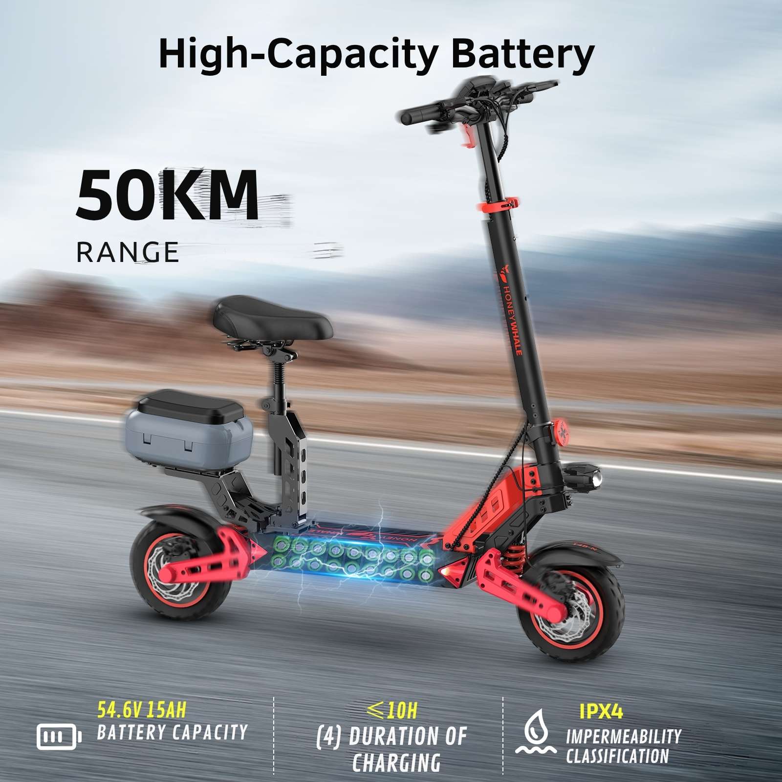 The Honey Whale T4B-N Electric Scooter is built for riders who need more than just speed—it’s designed for practicality, comfort, and everyday versatility. Powered by an 800W rated (1000W peak) motor and a 54.6V lithium-ion battery, the T4B-N reaches speeds of up to 55 km/h and delivers a real-world range of up to 50 km per charge, making it ideal for both commuting and weekend rides.