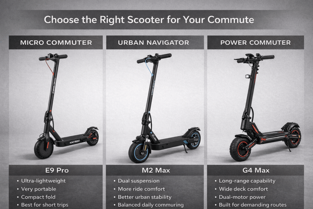 | Short, simple weekday commuting | Easy handling, practical range, low hassle | E9 Pro, E9T, E9 Max, E9 Max N | A good fit for riders who want a lighter, more straightforward commuting option |